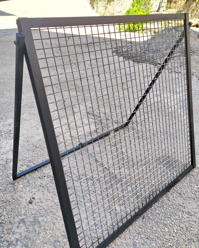 La grille est insérée dans un cadre en bois et est équipée de montants pour le tamisage vertical.